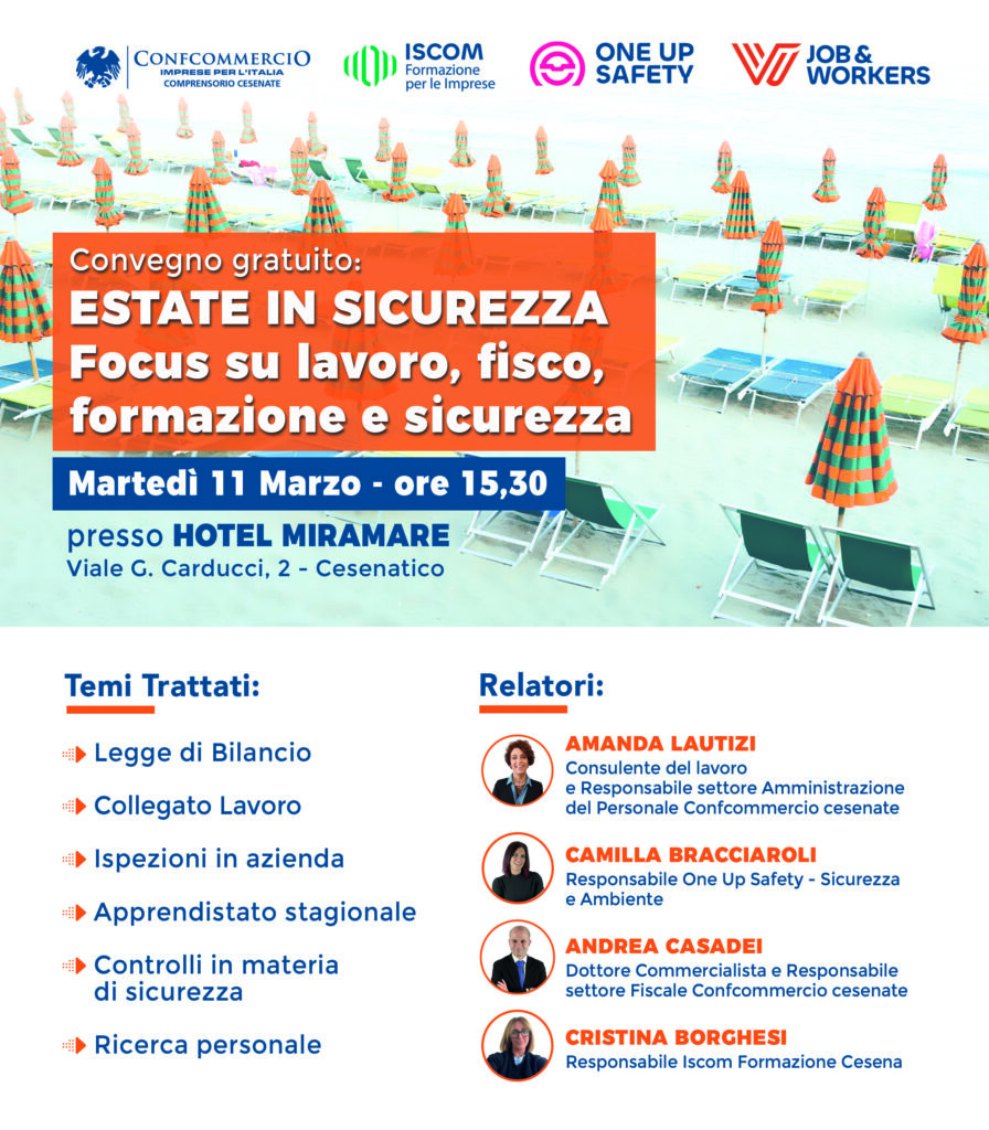 Martedì 11 Marzo – ore 15,30 presso HOTEL MIRAMARE Viale G. Carducci, 2 – Cesenatico Temi trattati: • Legge di Bilancio • Collegato Lavoro • Ispezioni in azienda • Apprendistato stagionale • Controlli in materia di sicurezza • Ricerca personale Iscriviti Nome Cognome Azienda Email Tel Delivery Condition Autorizzo il trattamento dei dati personali ai sensi dell'art.13 del Regolamento UE 679/2016 (GDPR) Iscriviti Relatori: Amanda Lautizi Consulente del lavoro e Responsabile settore Amministrazione del Personale Confcommercio cesenate Camilla Bracciaroli Responsabile del servizio One Up Safety Sicurezza e Ambiente Andrea Casadei Dottore Commercialista e Responsabile settore Fiscale Confcommercio cesenate Cristina Borghesi Responsabile Iscom Formazione Cesena Per Informazioni: Tel. 0547.80177 [email protected]