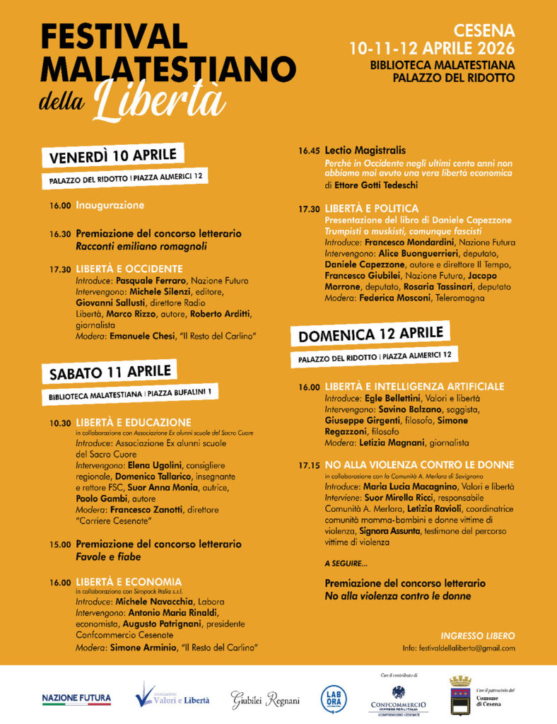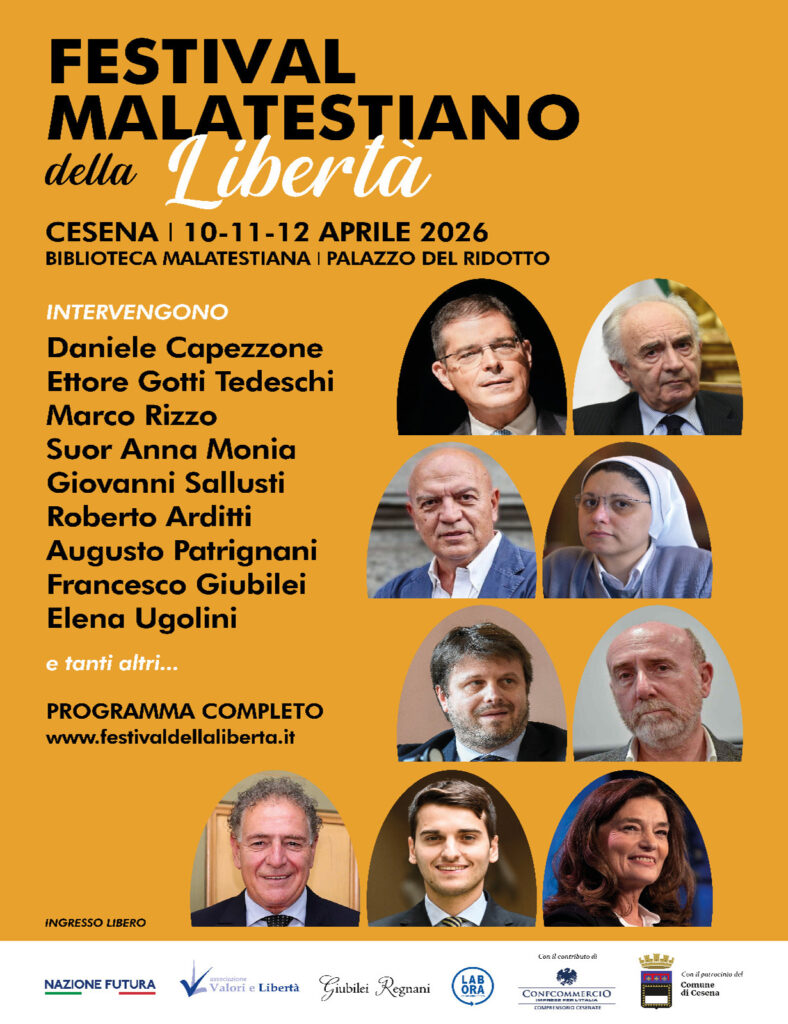 Il Festival Malatestiano della Libertà si terrà a Cesena dal 10 al 12 aprile 2026, presso la Biblioteca Malatestiana e il Palazzo del Ridotto. Tre giorni di incontri, dibattiti e approfondimenti dedicati al tema della libertà, affrontato da prospettive diverse: politica, economia, educazione, tecnologia e società.